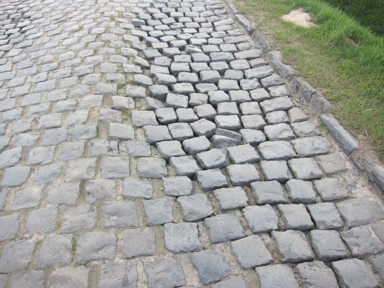But the most formidable component of the spring classics is cobbled roads. We’re not talking merely the well-formed paving stones used in many cities throughout Europe. These cobbles are rocks that were probably discarded by other street builders as too-misshapen, too peaked, too irregular, too sharp to be used on a normal traffic road, so they’re put in the “country road” pile. The TV commentators famously call these “Pave.” The locals are more no-nonsense; they simply call them “the stones.” These are laid down in lower densities, too, to cut the cost of paving the lightly travelled county roads – which means wider, and deeper gaps between the stones.