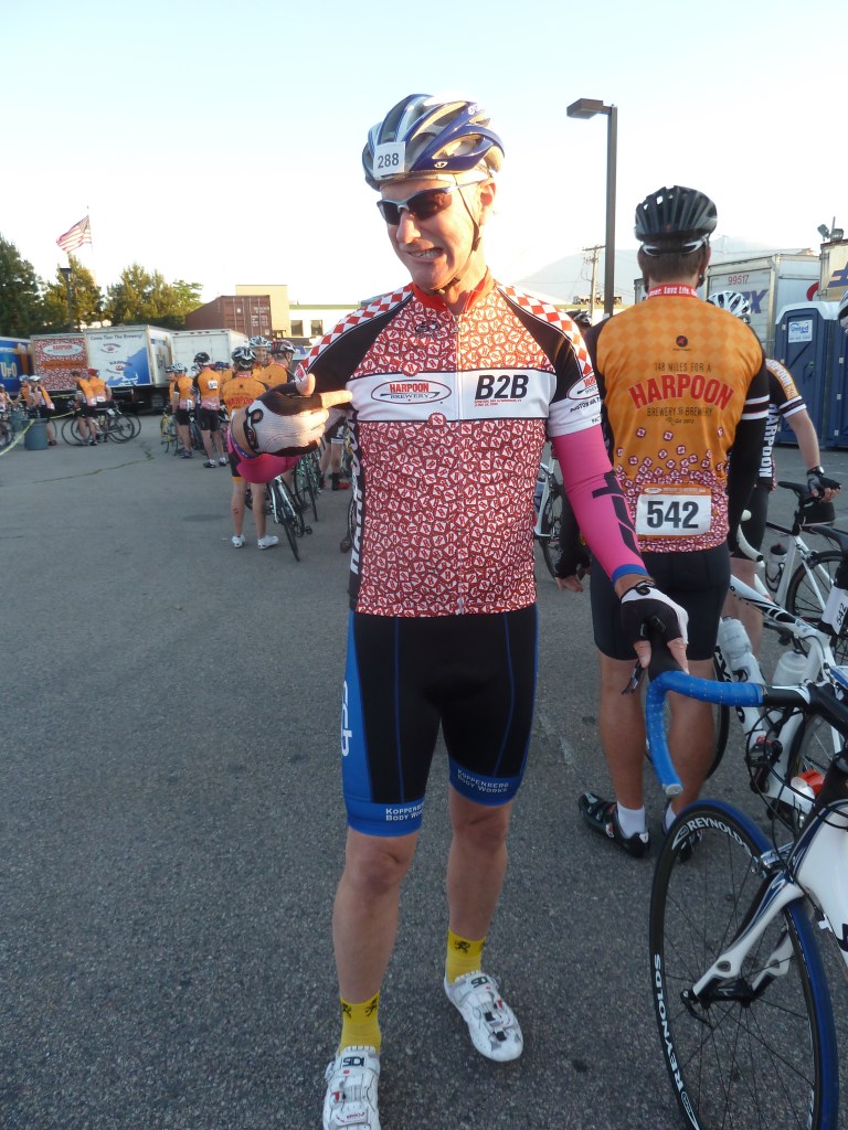 Anyway, I’m happy to have finished B2B #5, and Harpooned this Whale of a ride. And I rode it with some terrific people. My buddies Scott, Tom P., Tom C. and Joe all rode with me – despite my utter lack of cycling sartorial elegance (photo at right), and my tendency to fall behind on the hills – and then use my too-many pounds to pass them on the downhills. And best of all, my loving & giving wife Judy took time away from her business at Bragging Rights sunglasses and drove our sag wagon for 10 hours – then drove us home. 12 hours behind the wheel means she wins the angel of the month award. (Thanks, gorgeous!)